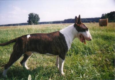| Plemeno: | bulteriér | Barva srsti: | žíhaná, bílé znaky, . |