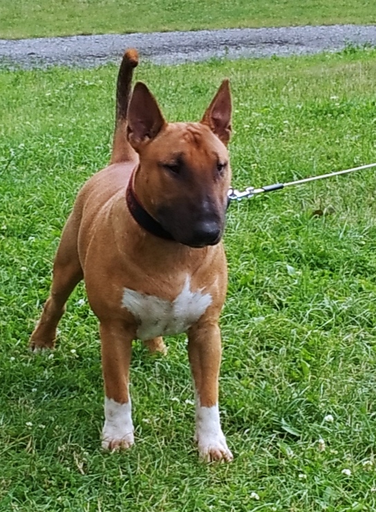| TEMPLAR Rasels Bull bulteriér, trikolor | Teirwgwyn TOP GUN bulteriér, trikolor | Teirwgwyn SON OF A GUN AT MEILOW bulteriér, červená, bílé znaky, ledviny UPC: Ano, pately: 0/0, BAER: +/+ |