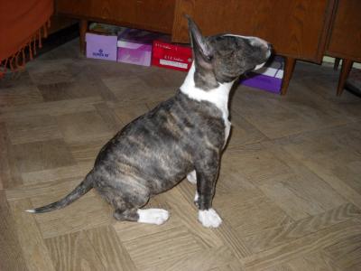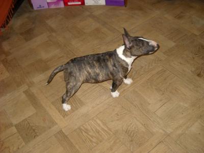 | Plemeno: | miniaturní bulteriér | Barva srsti: | žíhaná, bílé znaky, . |