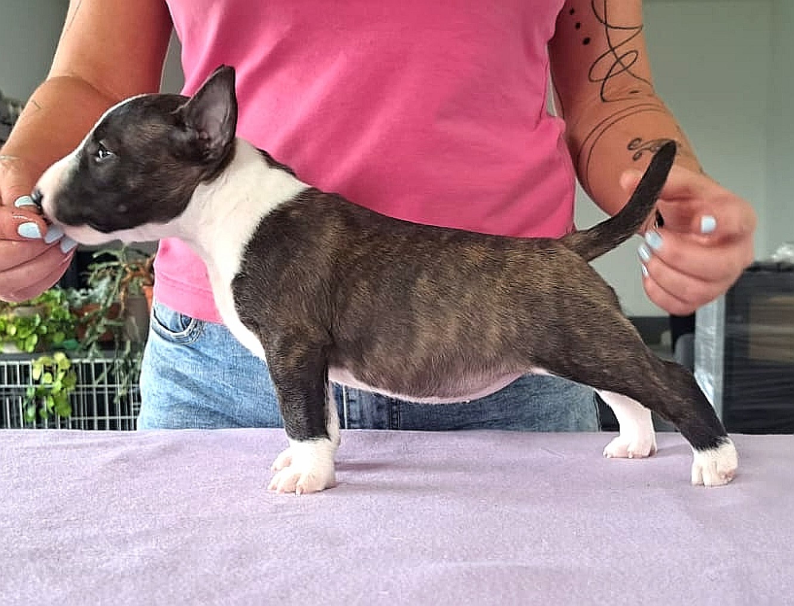 | Plemeno: | miniaturní bulteriér | Barva srsti: | žíhaná, bílé znaky, . |
