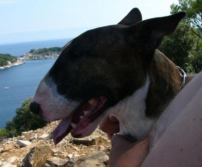 | Plemeno: | bulteriér | Barva srsti: | žíhaná, bílé znaky, . |