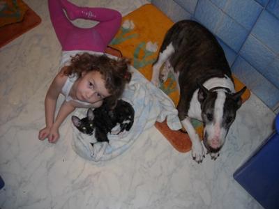 | BUBBLEGLASS Alet bulteriér, bílá | NOBODY IS PERFECT von der Alten Veste bulteriér, černá s žíháním, bílé znaky | |